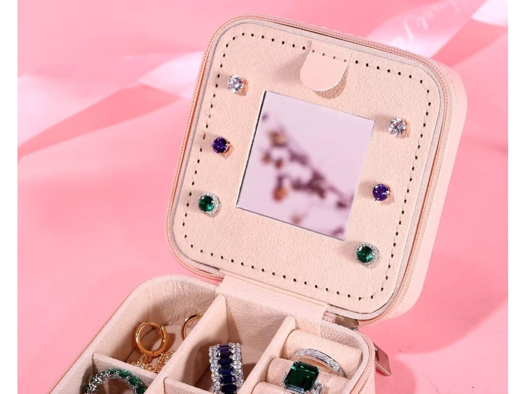 Lehké a kompaktní pouzdro má 6 držáků na prstýnky a 4 obdélníkové přihrádky, které lze vyjmout, což usnadňuje uložení předmětů. Dalších 6 přihrádek na náušnice, 3 háčky na řetízky a 1 mini kosmetické zrcátko.