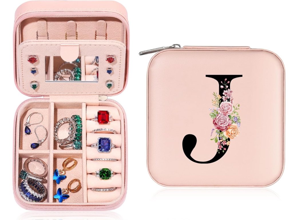 Personalizovaná dívčí mini šperkovnice s iniciálami "J" a květinami, cestovní, růžová