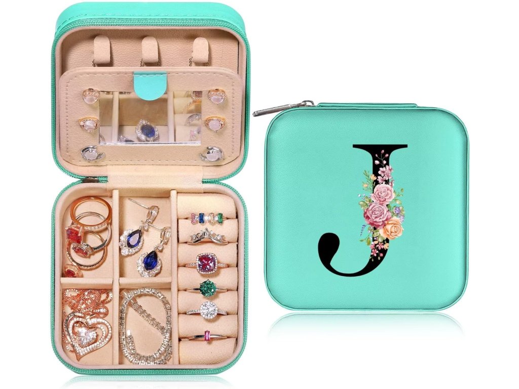 Personalizovaná dívčí mini šperkovnice s iniciálami "J" a květinami, cestovní, tyrkysová