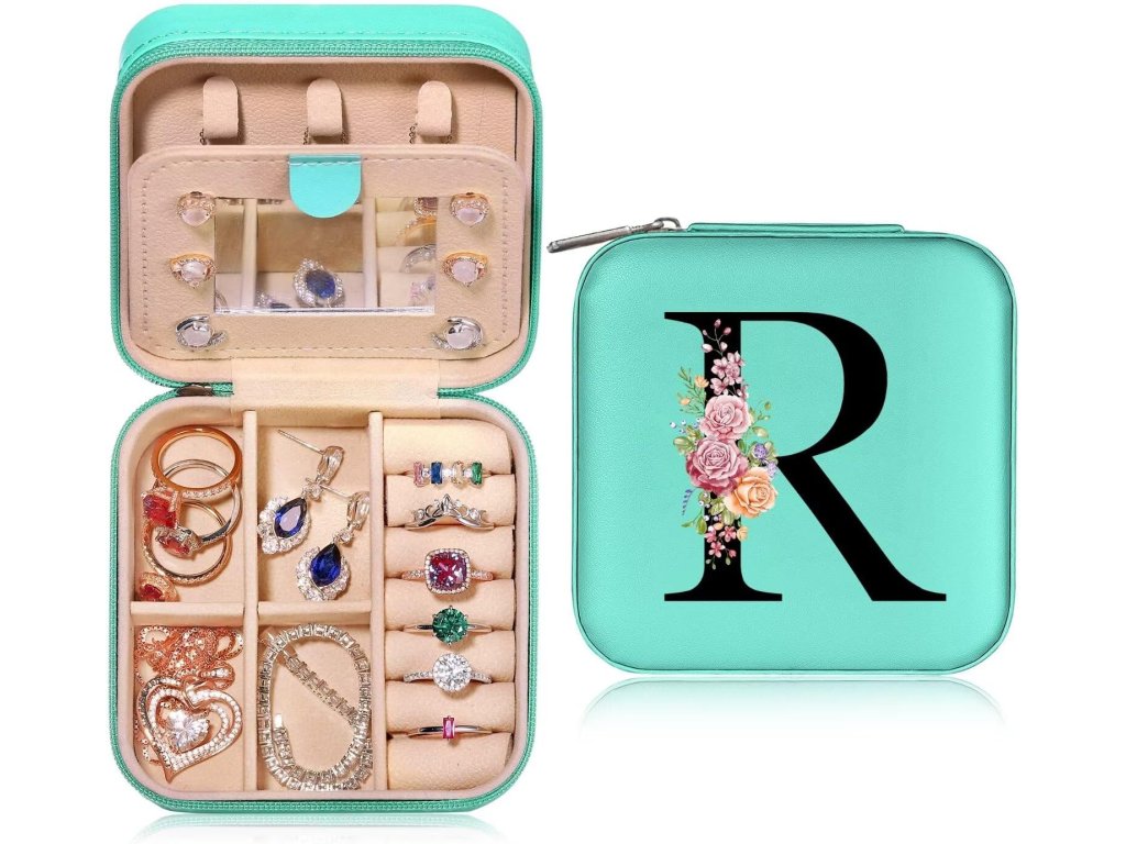Personalizovaná dívčí mini šperkovnice s iniciálami "R" a květinami, cestovní, tyrkysová