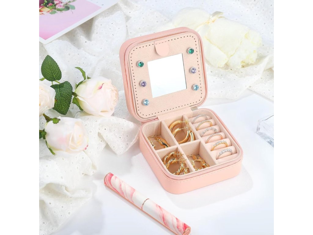 Lehké a kompaktní pouzdro má 6 držáků na prstýnky a 4 obdélníkové přihrádky, které lze vyjmout, což usnadňuje uložení předmětů. Dalších 6 přihrádek na náušnice, 3 háčky na řetízky a 1 mini kosmetické zrcátko.