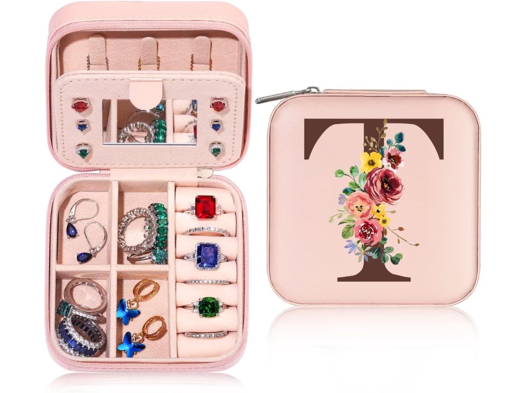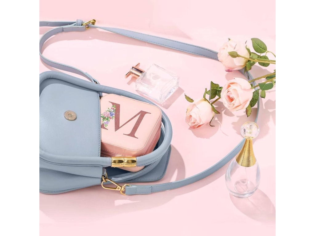 Personalizovaná dívčí mini šperkovnice s iniciálami "T" a květinami, cestovní, růžová