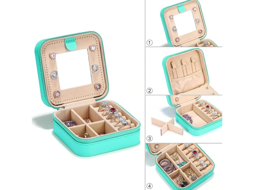 Lehké a kompaktní pouzdro má 6 držáků na prstýnky a 4 obdélníkové přihrádky, které lze vyjmout, což usnadňuje uložení předmětů. Dalších 6 přihrádek na náušnice, 3 háčky na řetízky a 1 mini kosmetické zrcátko.