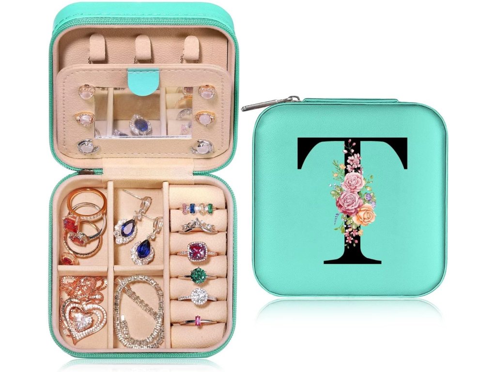 Personalizovaná dívčí mini šperkovnice s iniciálami "T" a květinami, cestovní, tyrkysová