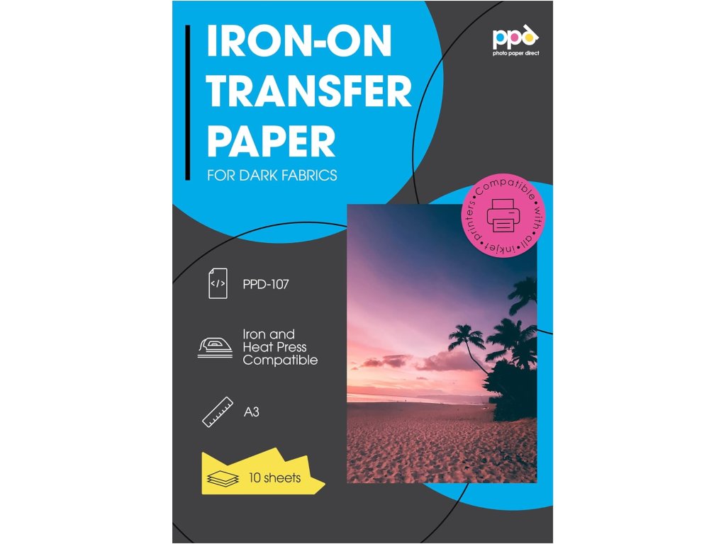 10ks A3 Inkjet Premium transferový papír pro černé (tmavé) textilie, PPD-107, DIN A3 (297 x 420 mm) × 10 listů, pravítko pro orientaci a silikonový papír.