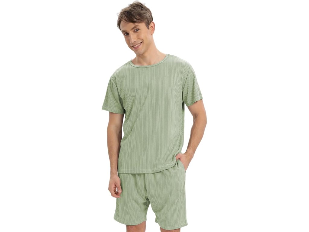 Pyžamo krátké pánské letní dvoudílné s elastickým pasem a kapsami, zelené