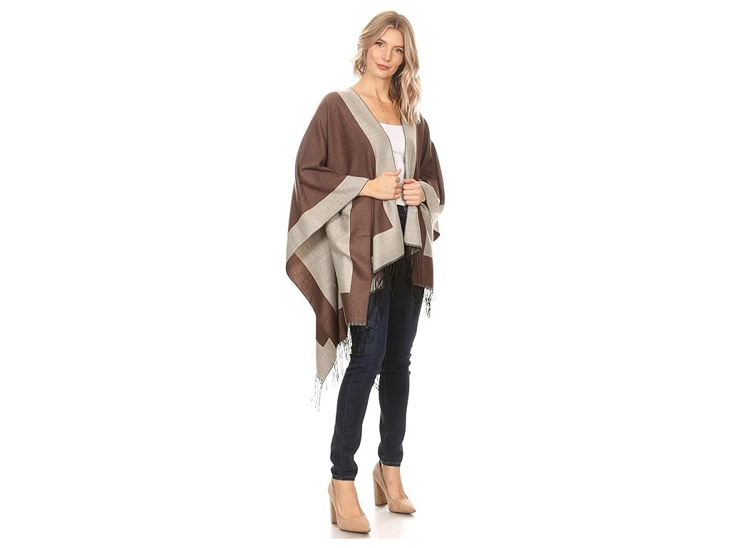 Lze použít také jako přikrývku pro studené podzimní večery. Toto pončo je oboustranné. Noste stranu, která se nejlépe hodí k vašemu outfitu. Kombinujte toto krásné pončo s šaty nebo obleky.