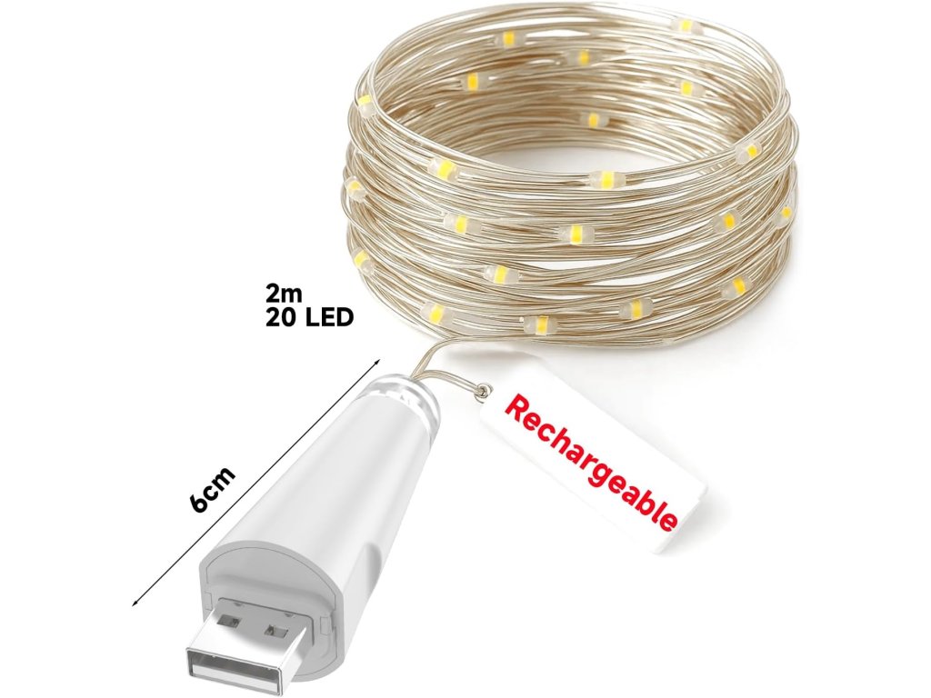 LED řetězové svítidlo je dodáváno s vestavěnou dobíjecí baterií 120 mAh (20 minut pro plné nabití). Dlouhotrvající osvětlení – až 14 hodin na jedno nabití.