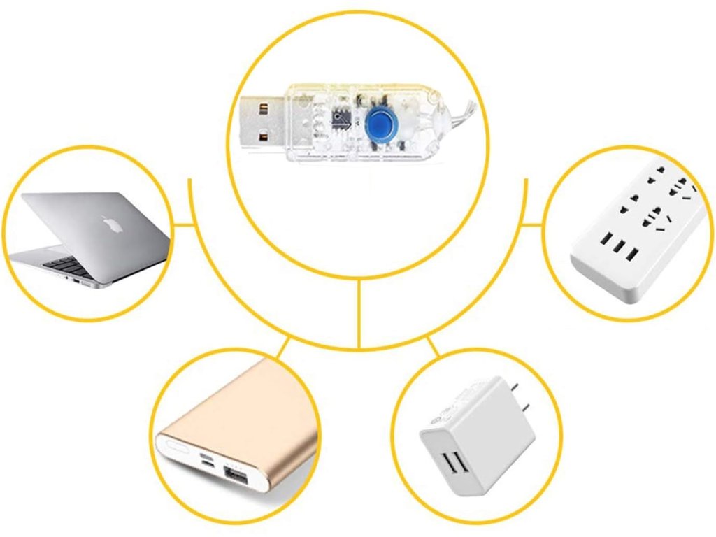 Světelné řetězy s rozhraním USB lze připojit k jakékoli nabíječce s portem USB pro napájení, jako jsou USB nabíječky, USB porty počítače, notebooku, powerbanky a jakémukoli napájecímu zařízení s portem USB.