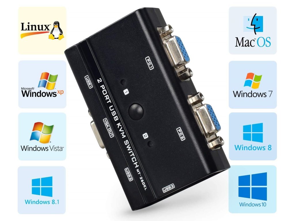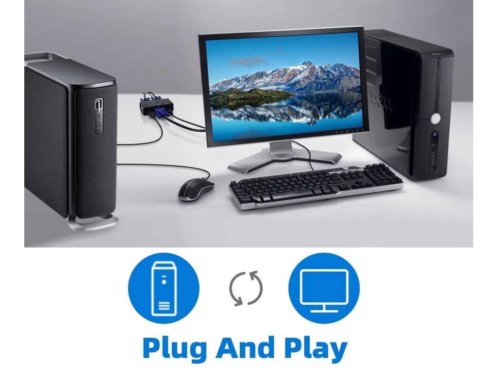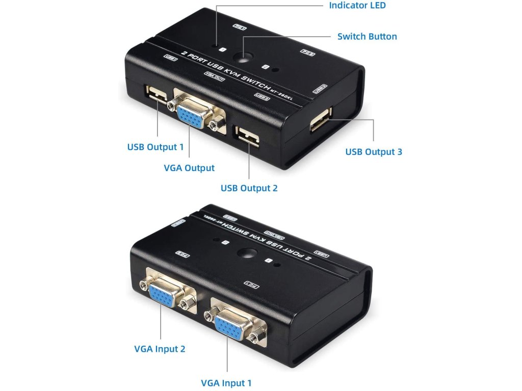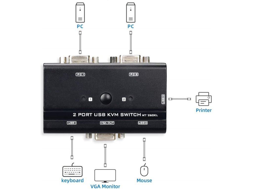 2portový USB VGA KVM Switch umožňuje ovládat 2 počítače pomocí jediné sady zařízení (myš, klávesnice, tiskárna a monitor).