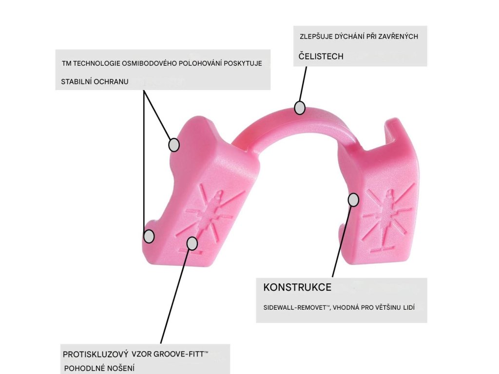 Originální design eliminuje poškození při tření po straně běžného náustku na dásně, což je praktické pro dýchání, mluvení a pití.