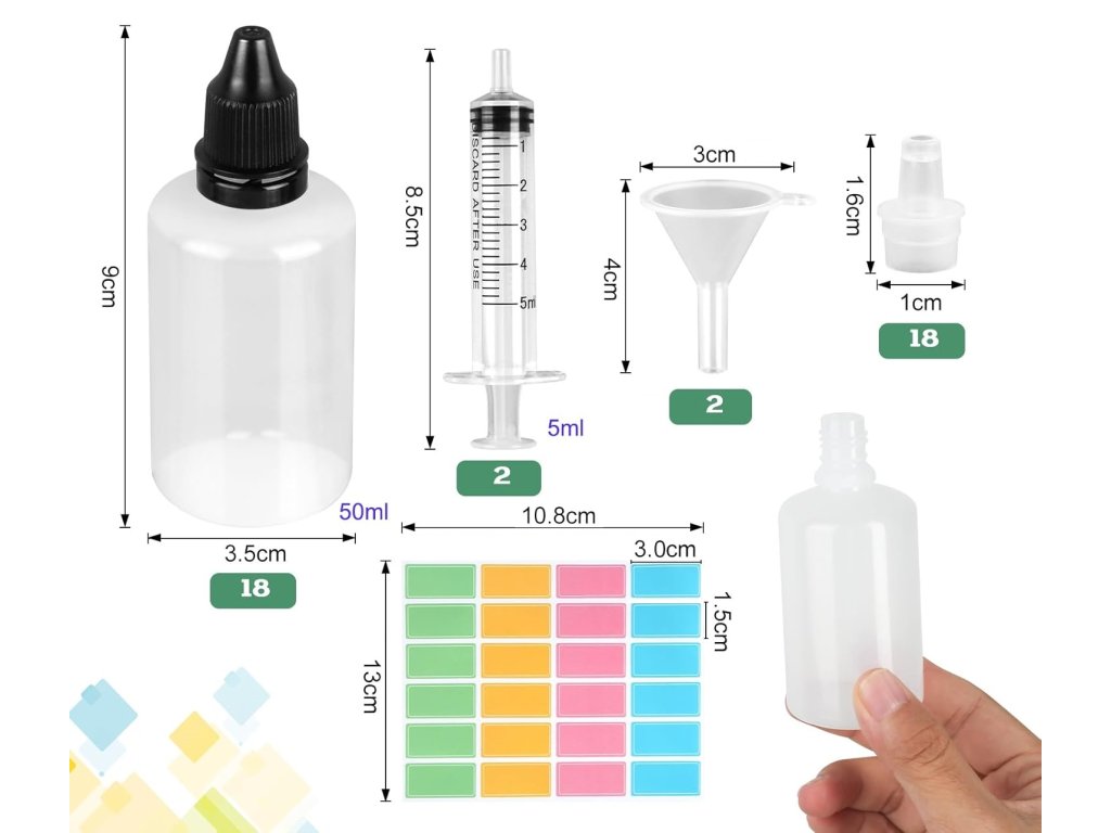 18ks lahvička 50ml s kapátkem, barevnými víčky, příslušenství