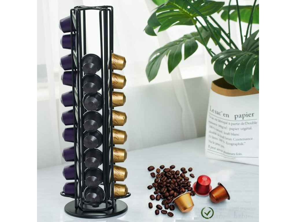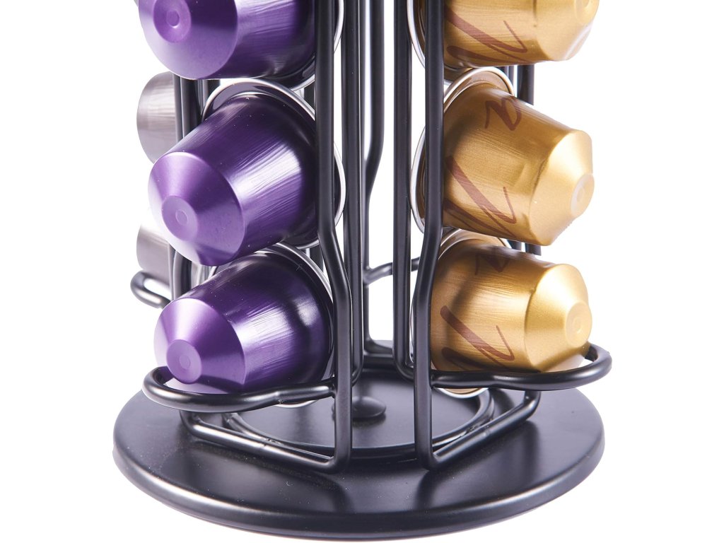 Držák na kapsle na kávu ušetří cenné místo na stole.