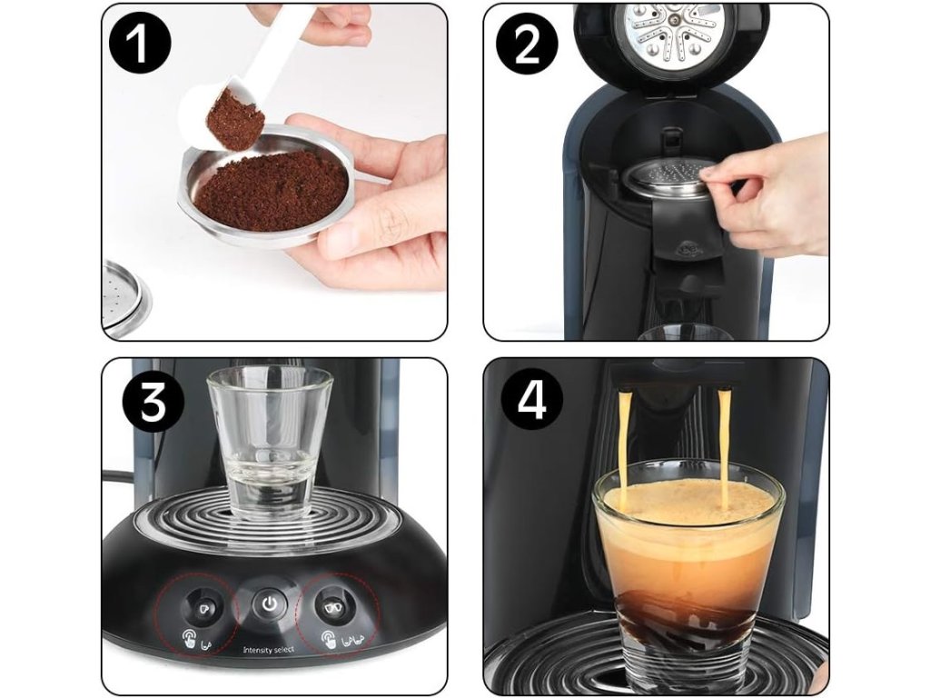 Snadná obsluha. Do kapsle přidejte 9 g jemné kávy, lehce přitlačte tamperem, zavřete víko a vložte jej do kávovaru, stiskněte malé tlačítko na šálek a můžete získat lahodný šálek kávy.