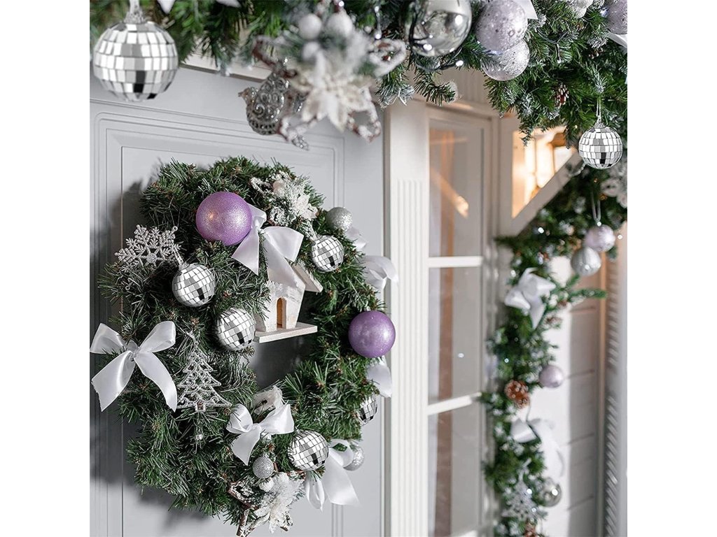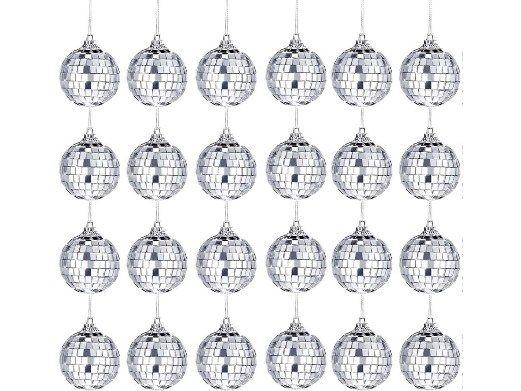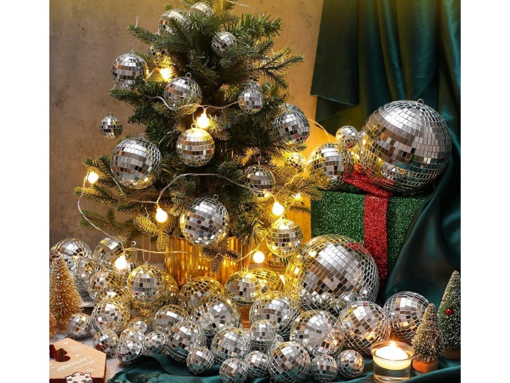 Zrcadlové koule o průměru 4 cm jsou ozdobeny mnoha malými stříbrnými zrcadly, takže odráží světlo.