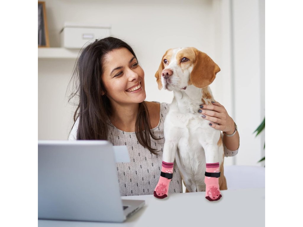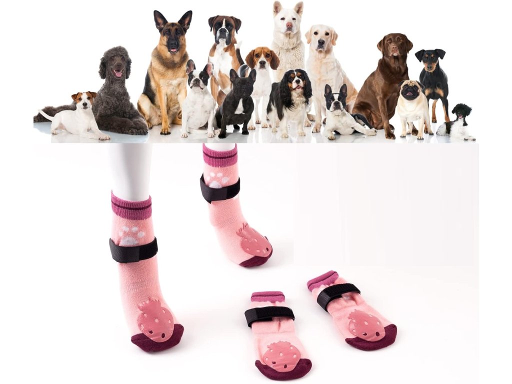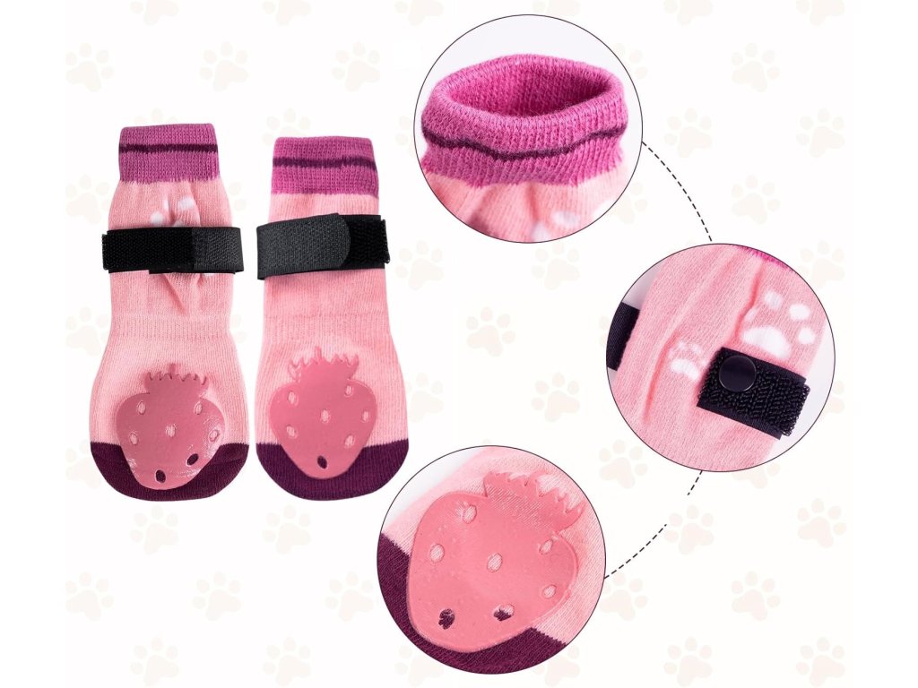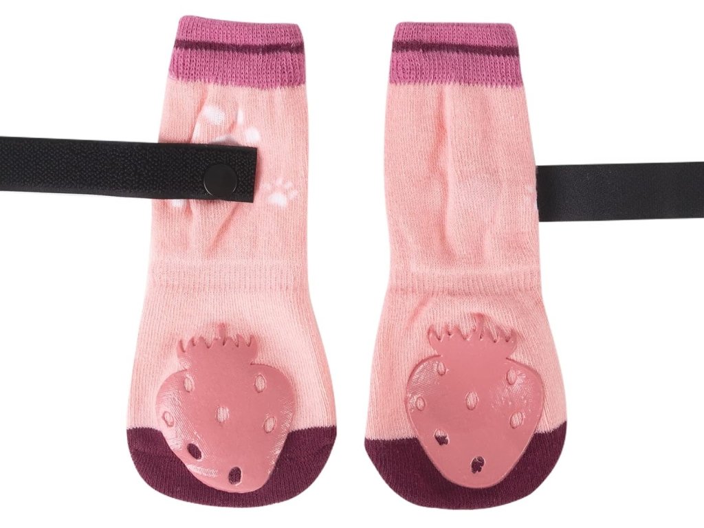 Ponožky pro psy mají oboustranný protiskluzový design a vnější strana ponožek má na přední a zadní straně silikonový vzor (jahoda), ten poskytuje dodatečnou trakci, která zabrání tomu, aby váš pes sklouzl na kluzkém povrchu.