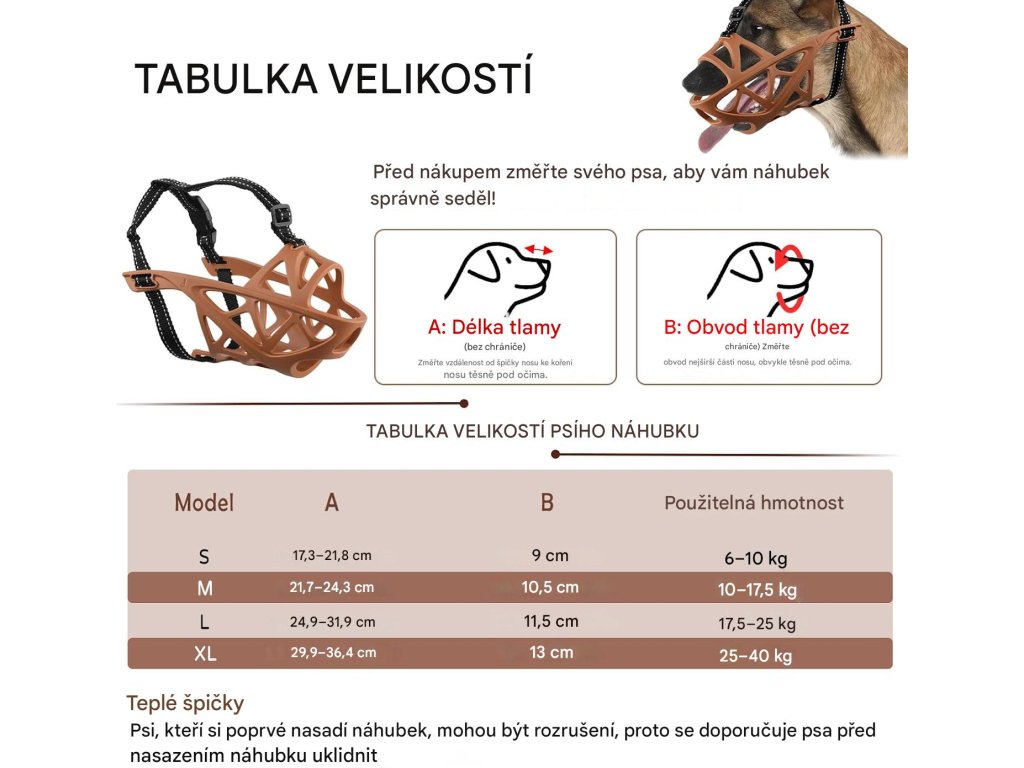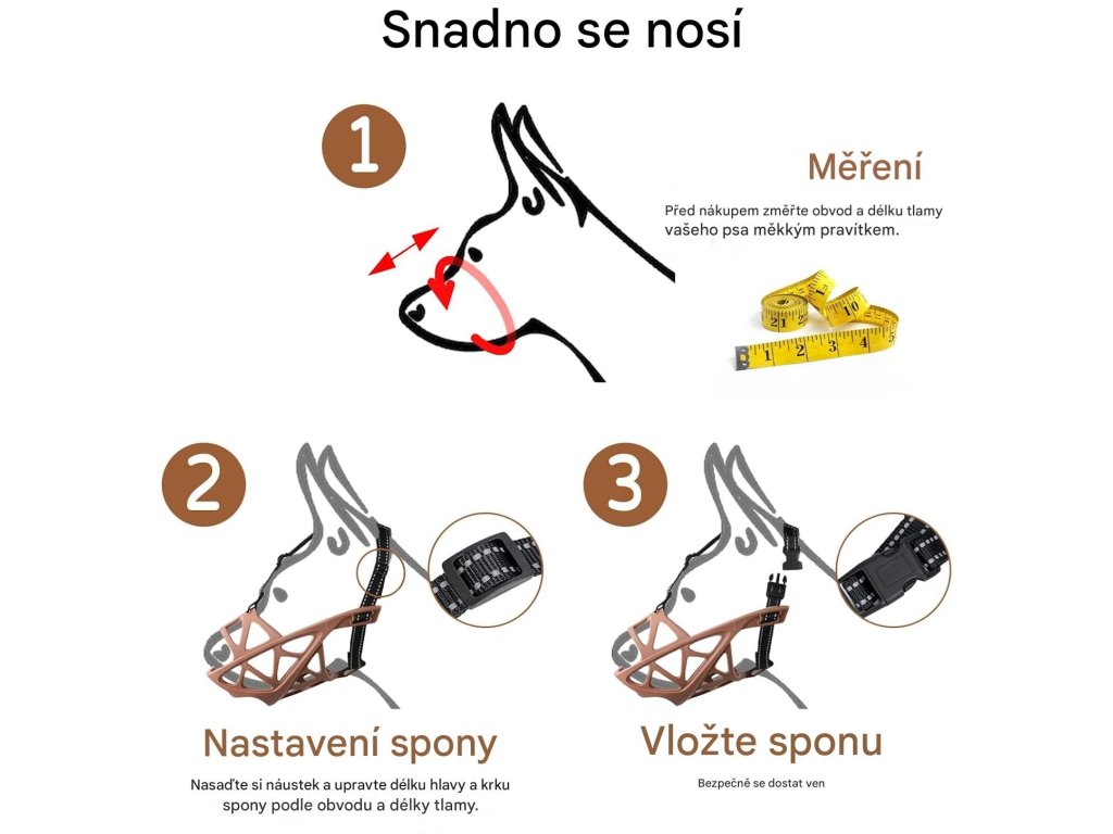 Před nákupem je důležité přesně změřit obvod nosu a délku hrdla vašeho psa, abyste zajistili perfektní tvar.