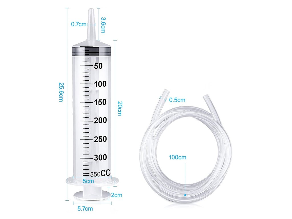 Stupnice stříkaček jsou velké a snadno čitelné, lehce průhledné pro přesnost, stříkačka s velkým objemem a 1m hadicí.