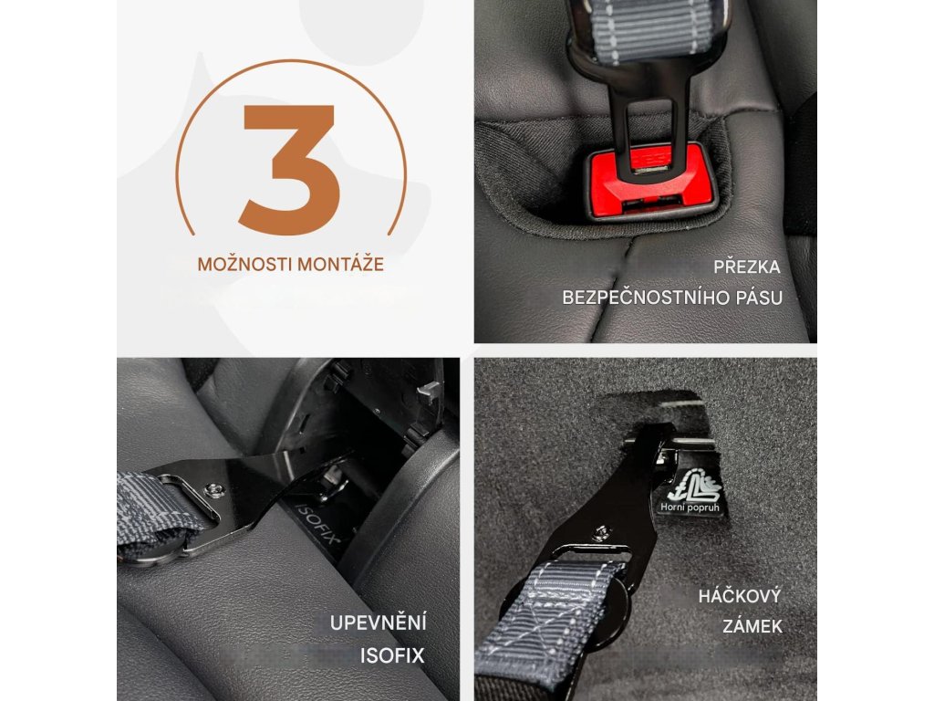 Udržujte aktivní psy bezpečně na svém sedadle. 3 možnosti upevnění viz foto.